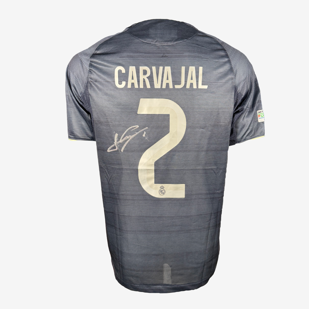 احتفل بأحد أكثر مدافعي ريال مدريد موثوقية وتكريماً بهذه القميص الرسمي الخارجي لموسم 2025/26 الموقع بخط اليد من قبل داني كارفاخال. تم توقيع القميص شخصياً في مركز تدريب ريال مدريد بتاريخ 14 ديسمبر 2025 ويُمثل فصلاً حديثاً في مسيرة أيقونة حقيقية للنادي.