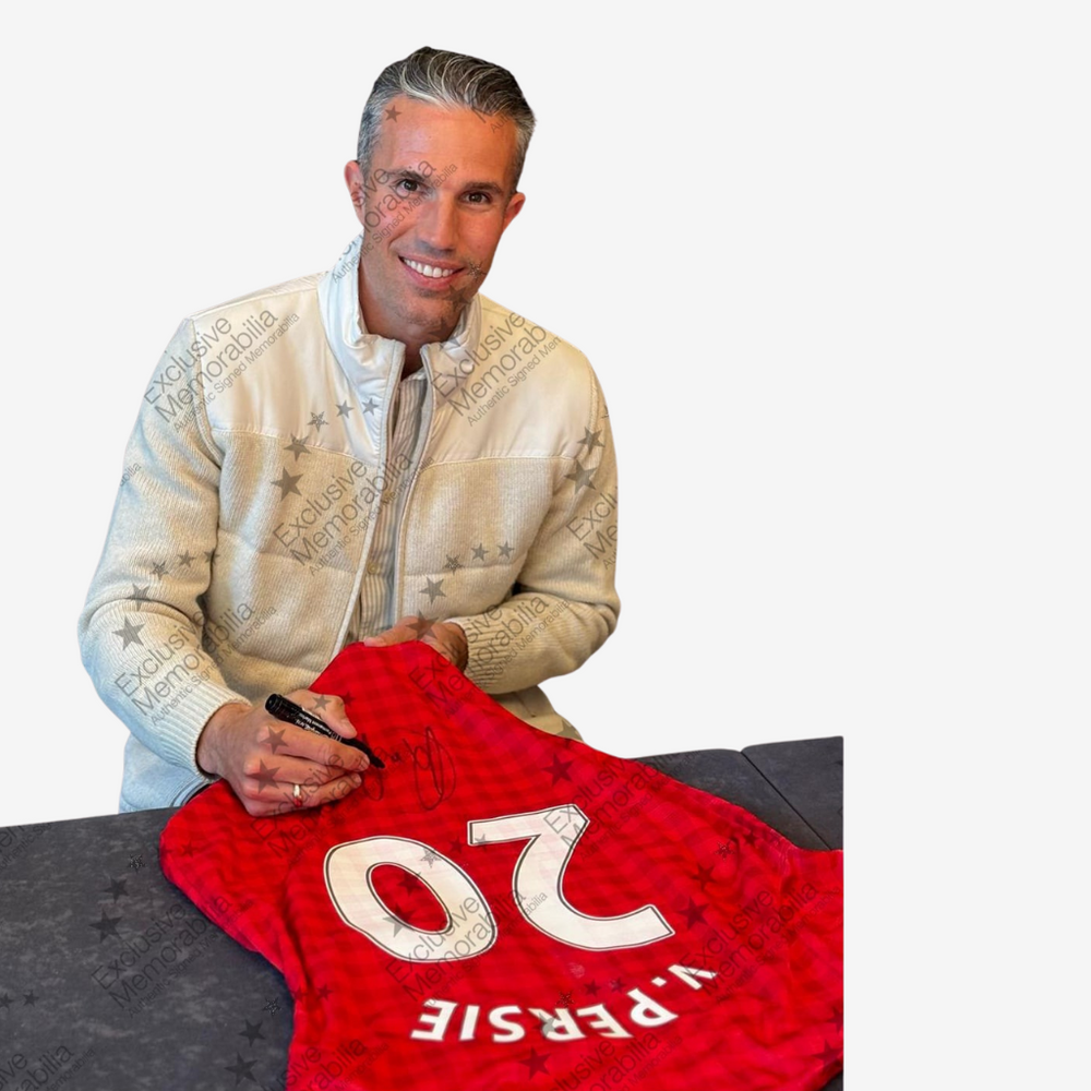 وقع روبن فان بيرسي على هذا القميص في لندن في 21 مايو 2025. هذا هو نمط القميص الذي ارتداه فان بيرسي خلال موسم 2013-14، بما في ذلك المباراة التي سجل فيها الهدفين في فوز مانشستر يونايتد 2-0 على ويجان أثليتيك للفوز بدرع المجتمع الإنجليزي 2013.
