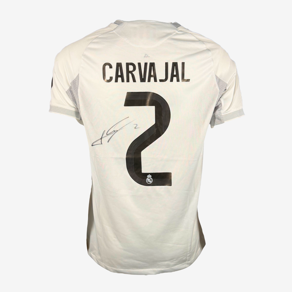 Feiern Sie einen der verlässlichsten und am meisten ausgezeichneten Verteidiger von Real Madrid mit diesem handsignierten Real Madrid 2025/26 Auswärtstrikot von Dani Carvajal. Das Trikot wurde persönlich im Real Madrid Trainingszentrum am 14. Dezember 2025 signiert und steht für ein modernes Kapitel in der Karriere einer wahren Vereinsikone.