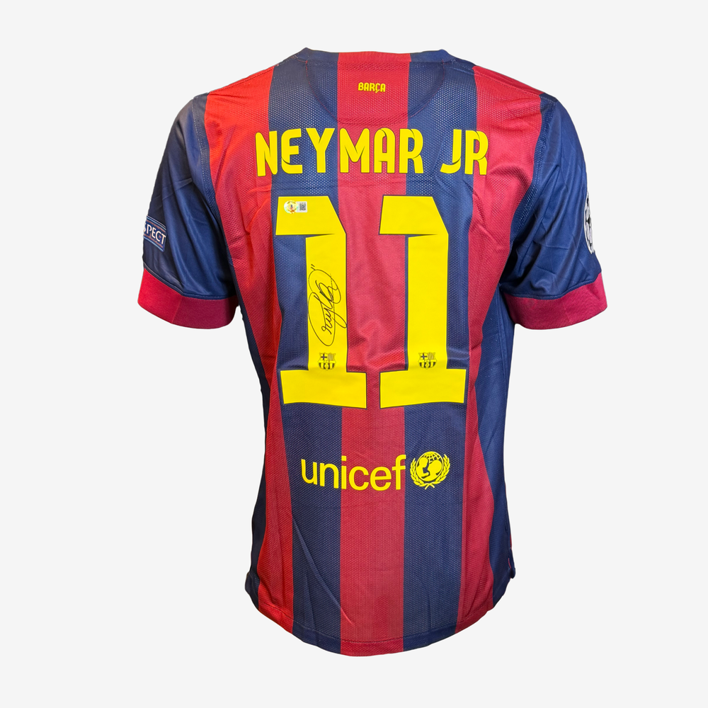 This signed 2014 15 home shirt is a tribute to Neymar at his explosive best and to one of the most dominant Barcelona teams ever assembled. It is an essential collectible for Barcelona fans, Champions League enthusiasts and admirers of one of the most skilful forwards of his generation.