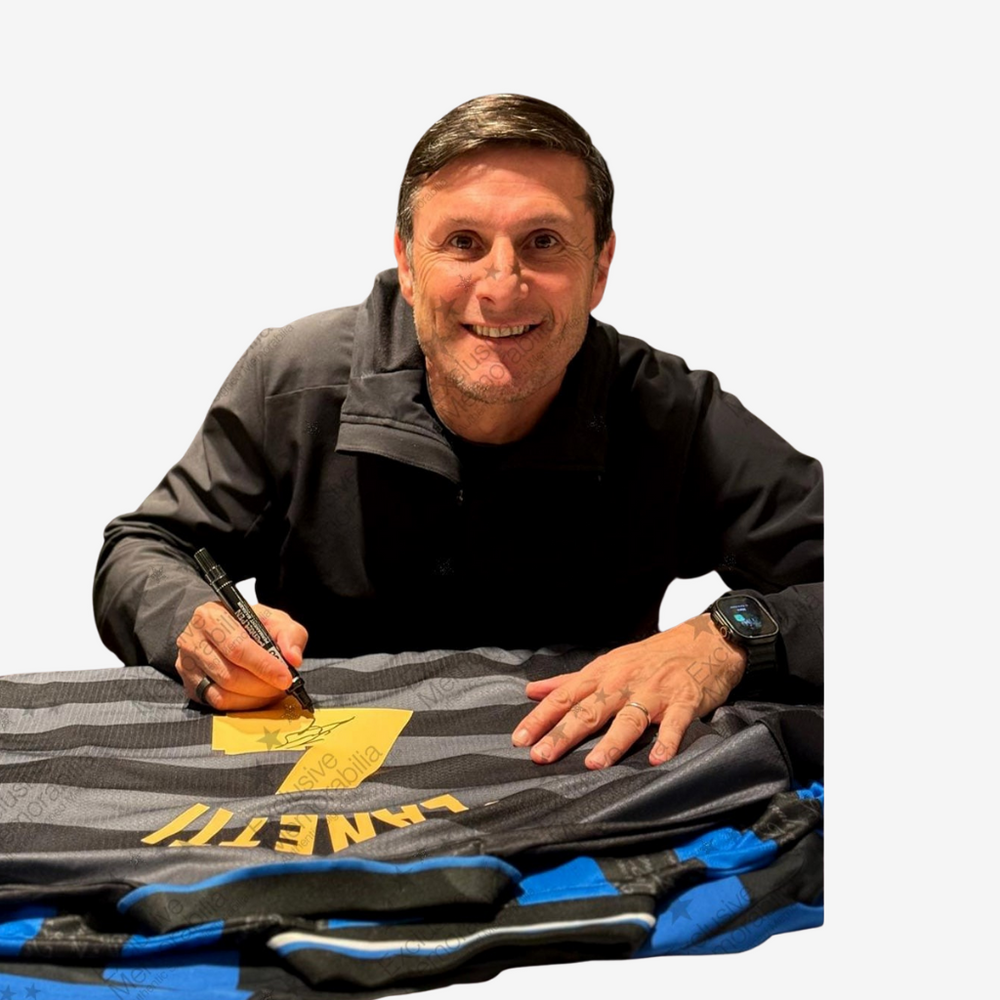 Javier Zanetti firmó esta camiseta en Milán el 1 de abril de 2025. Este es el modelo de camiseta que usó el Inter de Milán durante la final de la Copa de la UEFA 1997-98, donde el Inter derrotó a la Lazio 3-0. Zanetti anotó el segundo gol en la final, ayudando a asegurar el trofeo para los Nerazzurri. A lo largo de su ilustre carrera, Zanetti disputó más de 600 partidos con el Inter entre 1995 y 2014.