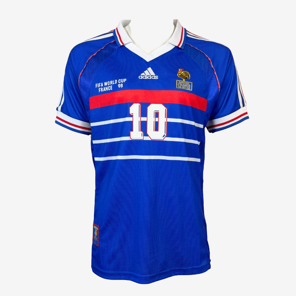 Celebra uno de los momentos más icónicos en la historia del fútbol con esta exclusiva camiseta de local de la Final de la Copa del Mundo de Francia 1998, firmada a mano por Zinedine Zidane. Esta camiseta retro fue firmada personalmente por Zidane durante una sesión privada de firmas en Madrid el 12 de diciembre de 2022, y está autenticada por Beckett.