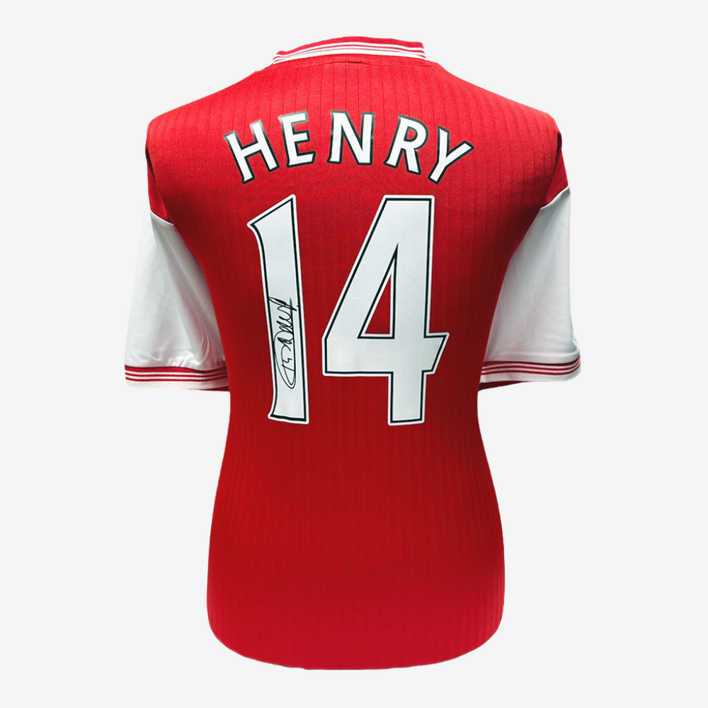 アーセナルの歴代最多得点者のレガシーを祝う、ティエリ・アンリ直筆サイン入りの限定アーセナルセンテナリー・レトロホームシャツです。この公式レトロシャツはアンリの時代のクラシックなデザインを採用しており、伝説的ストライカー本人のサインが入っています。アンリのサインはサッカー界でも最も希少で人気の高いものの一つです。