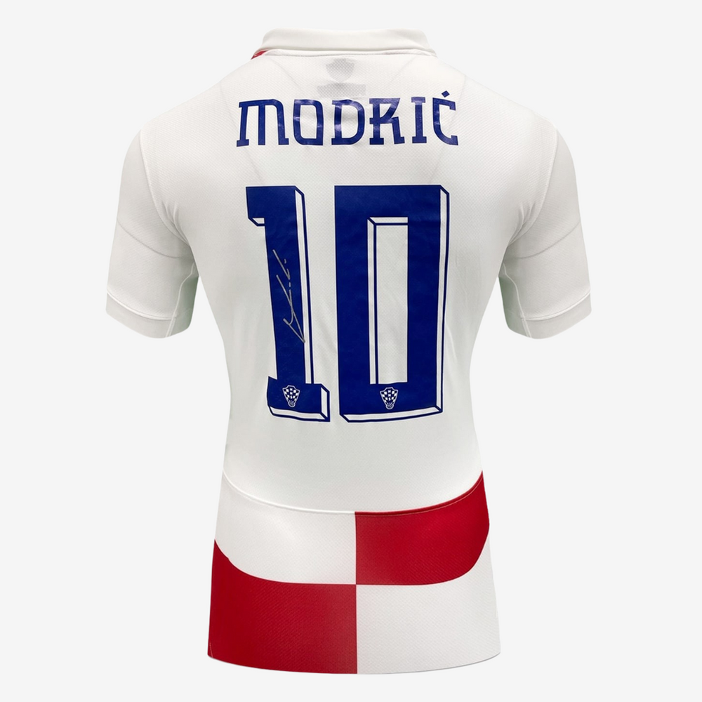 ルカ・モドリッチは2025年3月14日にマドリードでこのシャツにサインしました。このシャツは、モドリッチとクロアチアがEURO 2024で着用したスタイルで、グループステージのイタリア戦で得点し、欧州選手権史上最年長得点者となった記念の一着です。モドリッチは2007年から2024年の間にクロアチア年間最優秀選手に13回も選ばれ、その伝説的な地位を確立しています。