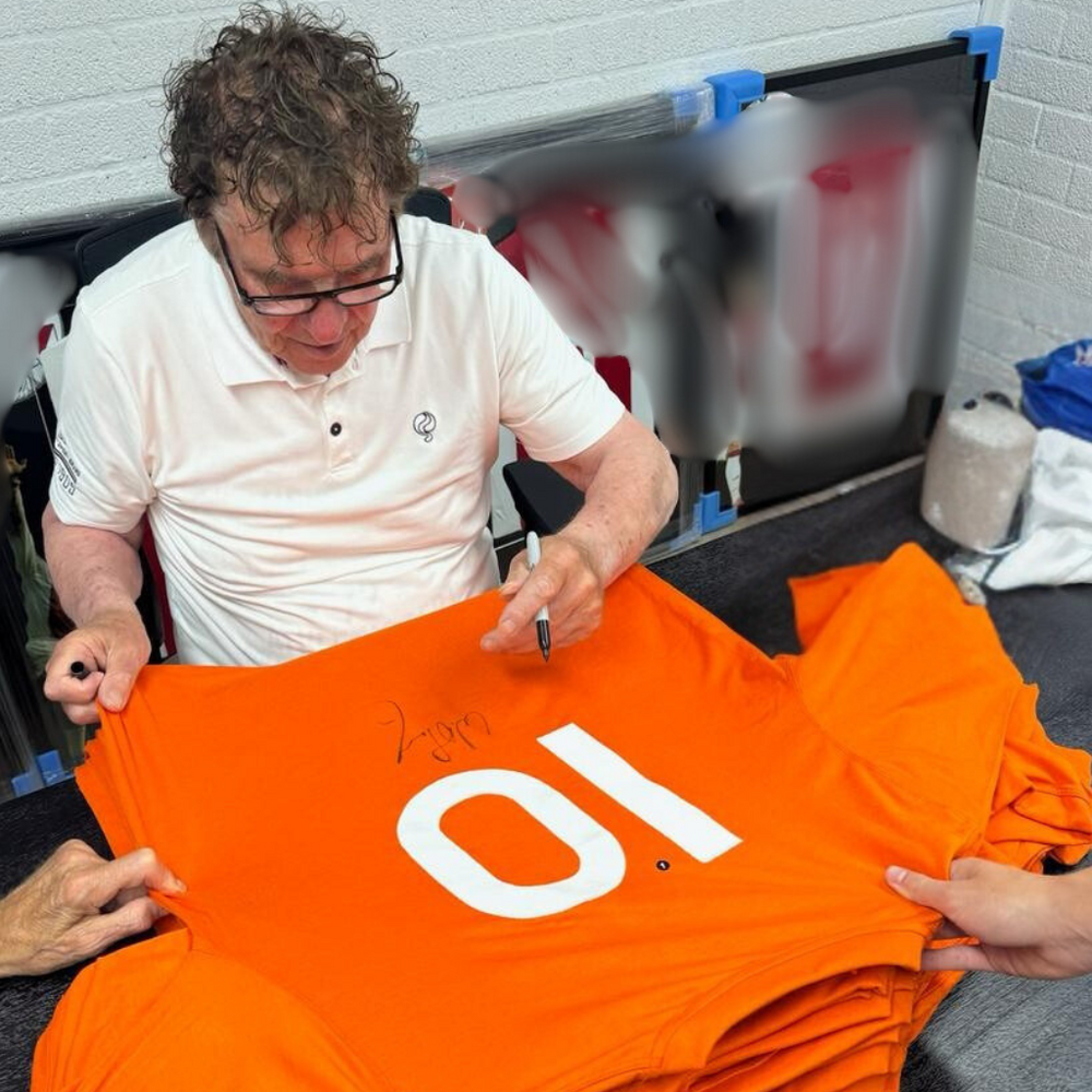 オランダのサッカー伝説、ウィレム・ファン・ハネヘムの直筆サイン入りオランダ代表ホームシャツで、その偉大な功績を称えましょう。このクラシックなオレンジのコットンシャツは、刺繍のディテールと背面の象徴的な背番号10が特徴です。シャツは2025年7月2日にアムステルダムで行われたプライベートサイン会で、ファン・ハネヘム本人によって直筆サインされました。