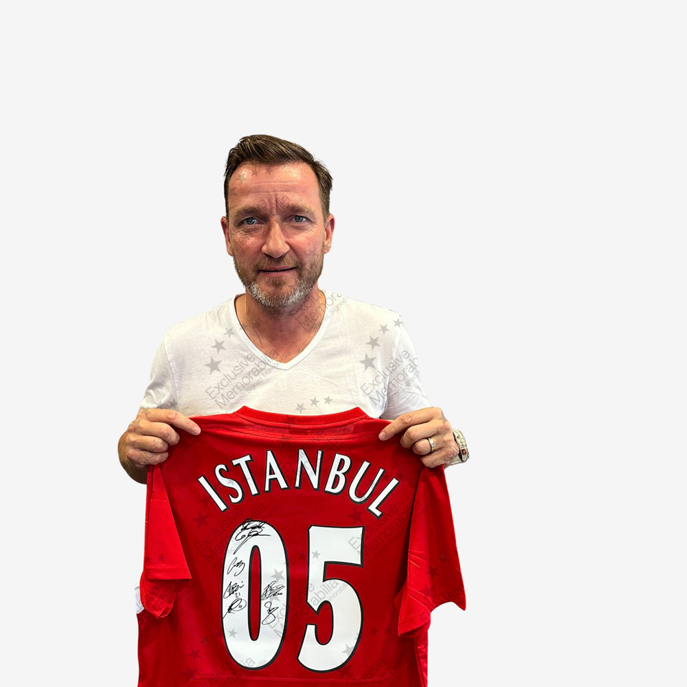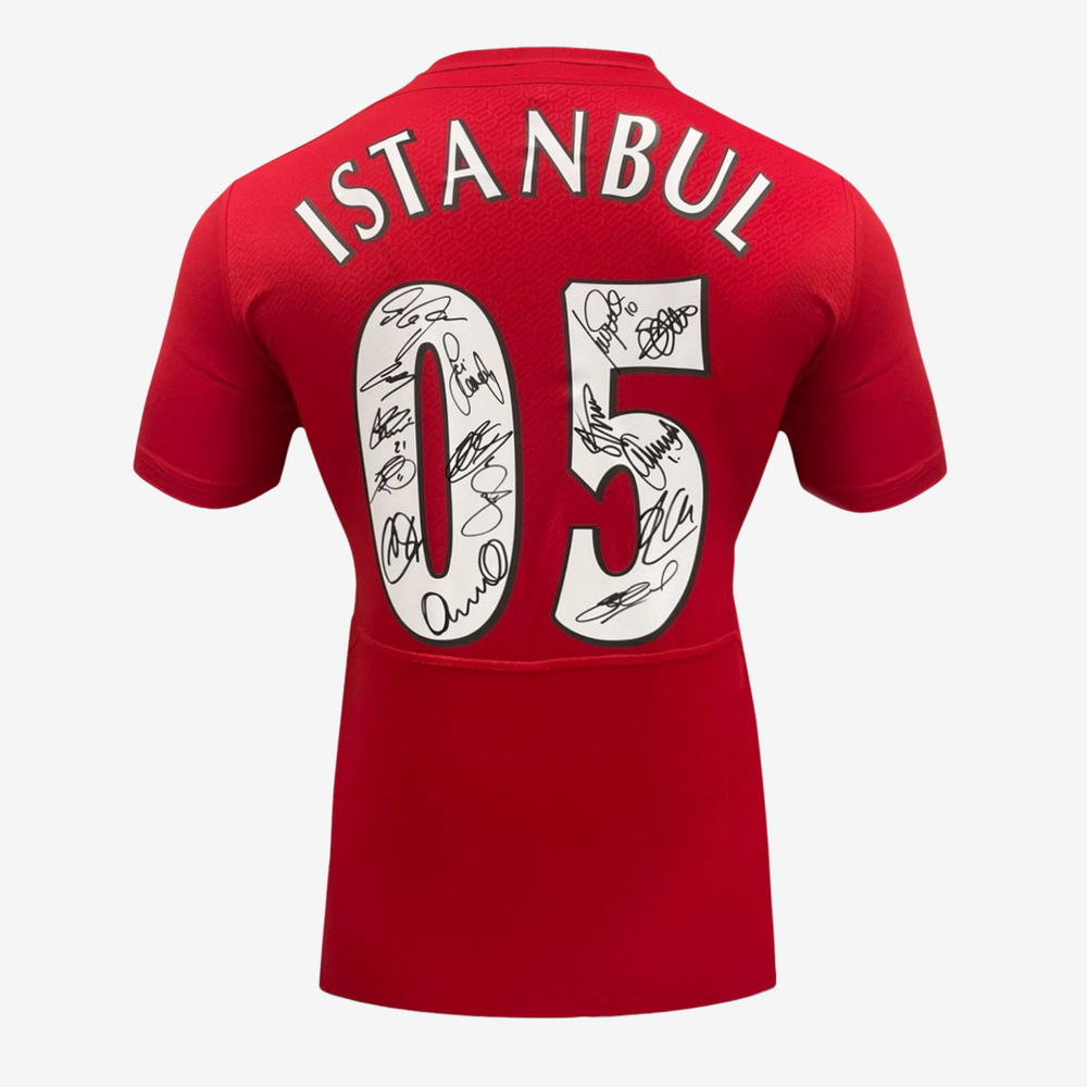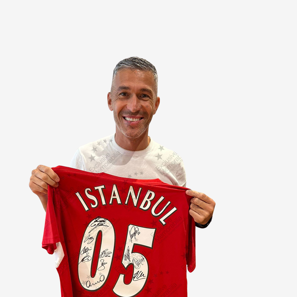 This shirt connects directly to one of the most memorable nights in European football. On May 25, 2005 in Istanbul, Liverpool came from three goals down to equalise and win the Champions League final on penalties. Every signature on this shirt belongs to someone who took part in that story.