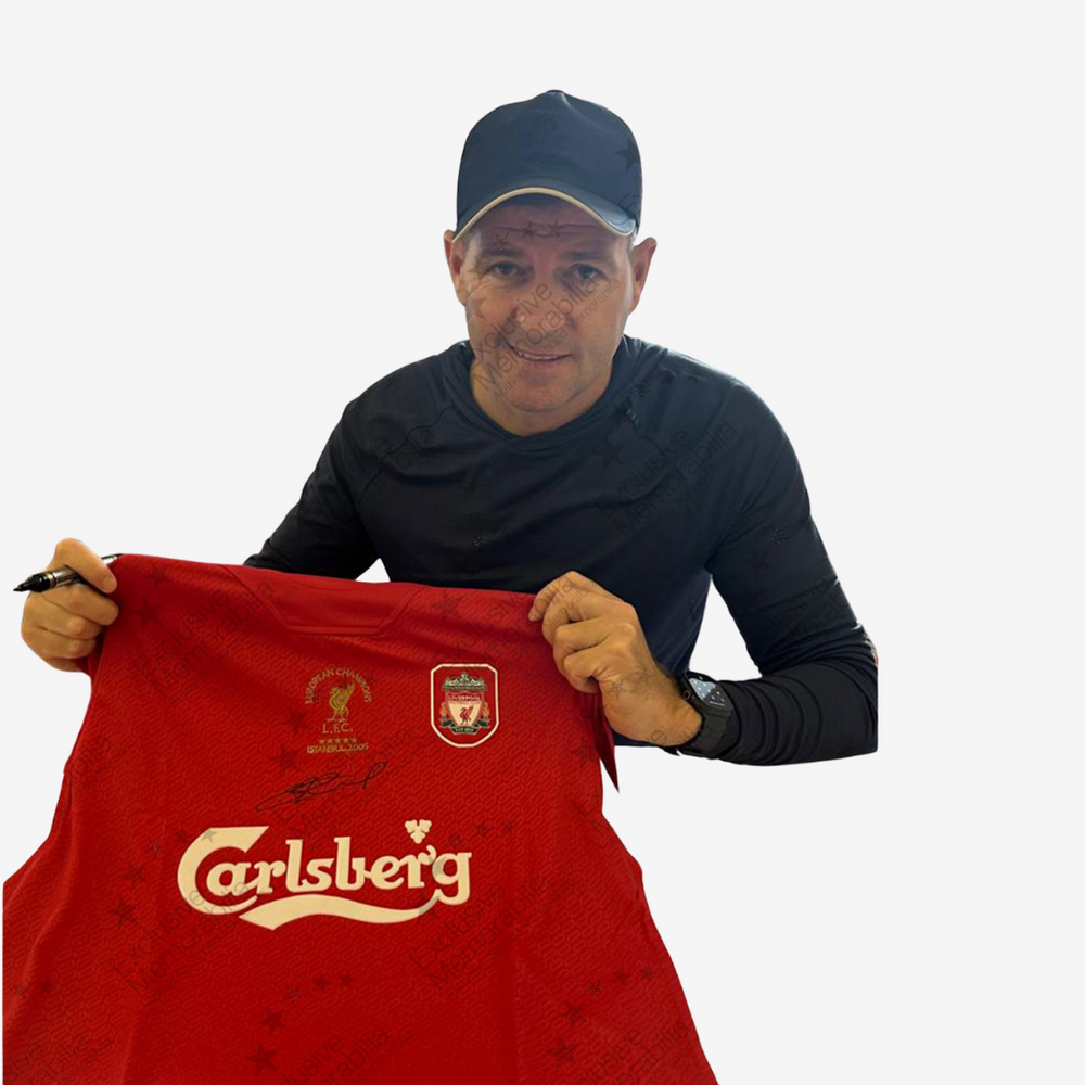 Steven Gerrard signed this shirt in Formby on July 31, 2025. This is the style of shirt worn by Liverpool during the legendary 2005 Champions League final in Istanbul, where Gerrard scored the first of three second-half goals to spark Liverpool’s incredible comeback against AC Milan. The match ended in a dramatic penalty shootout, securing Liverpool’s fifth European Cup.