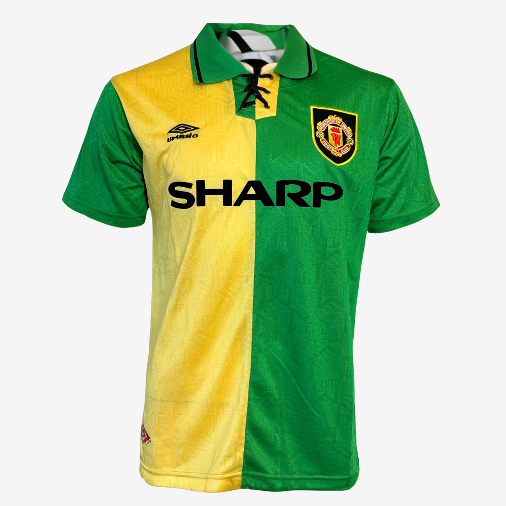 Dit is het type shirt dat Cantona droeg toen hij Manchester United hielp naar Premier League-glorie te leiden, en snel een publiekslieveling werd dankzij zijn flair, charisma en onvergetelijke nummer 7. Het unieke geel-groene uittenue is een waar verzamelobject en een eerbetoon aan de rijke geschiedenis van de club.