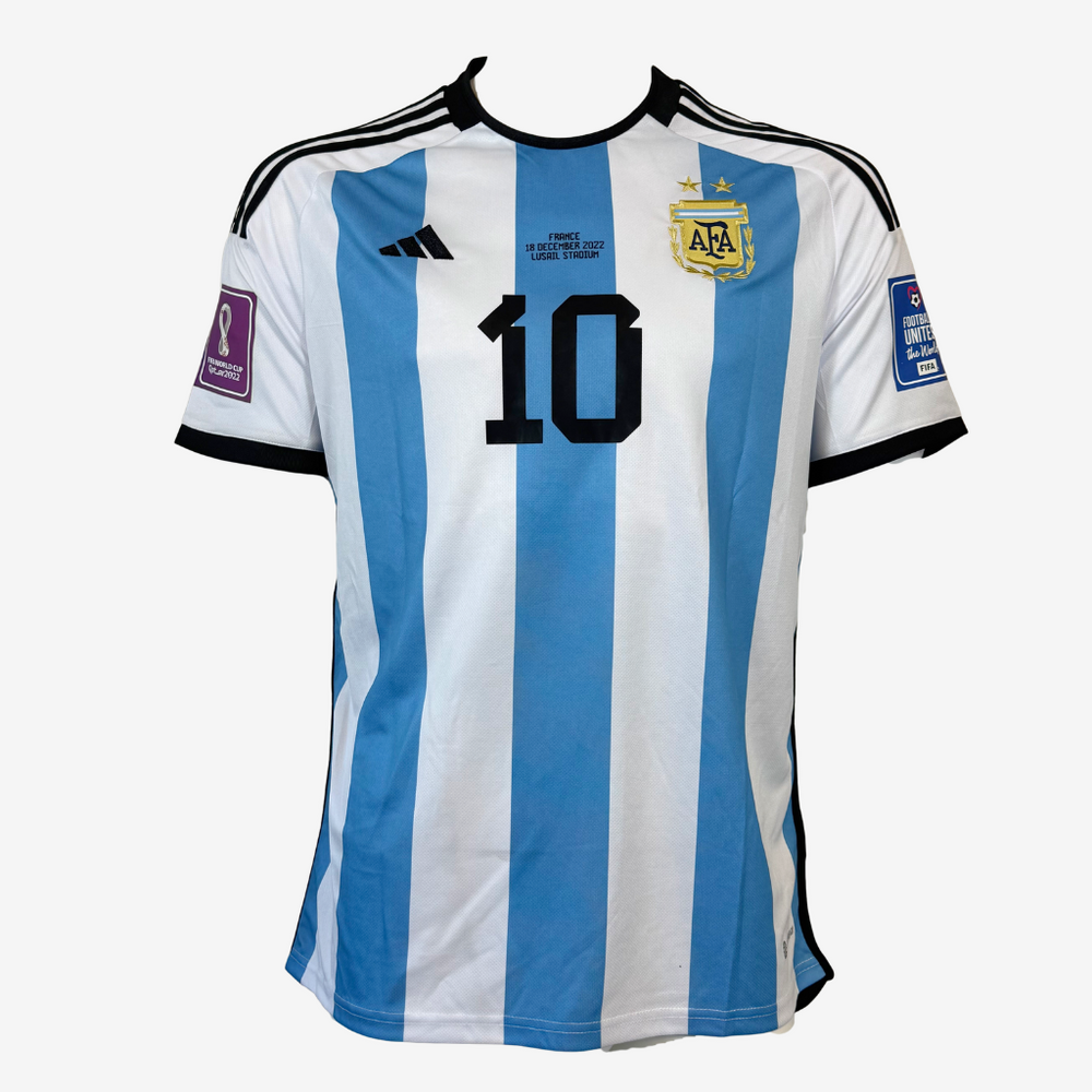 Dit is het type shirt dat Messi droeg toen hij Argentinië als aanvoerder naar de WK-glorie in Qatar leidde, waarbij hij twee keer scoorde in de finale en zijn penalty benutte in de strafschoppenserie om Argentinië’s derde wereldtitel veilig te stellen. Messi’s prestaties gedurende het toernooi leverden hem de Gouden Bal op als beste speler, waarmee hij zijn status als een van de grootste voetballers aller tijden verder bevestigde.