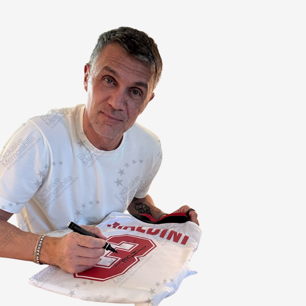 Paolo Maldini signeerde dit shirt in Milaan op 19 maart 2025. Dit is het type shirt dat AC Milan droeg tijdens de onvergetelijke Europese Cupfinale van 1994 tegen Barcelona. Maldini en Milan domineerden de finale en wonnen met 4-0, waarmee ze de vijfde Europese titel van de club veiligstelden. Deze overwinning betekende de derde keer dat Maldini de Europese Cup met Milan omhoog hield, en hij zou deze later nog twee keer winnen, in 2003 en 2007.
