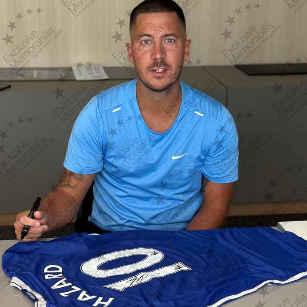 Eden Hazard personally signed this shirt in Madrid on July 11, 2025. This style jersey was worn by Hazard during Chelsea’s 2016-17 season, when the Blues lifted their 5th Premier League title and reached the FA Cup final. That year, Hazard scored his 50th Premier League goal for Chelsea, becoming only the sixth player in club history to reach this milestone.