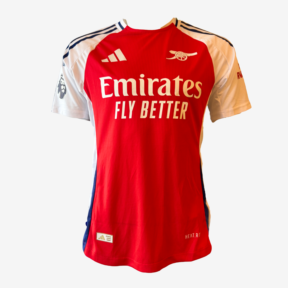The 2024–25 home shirt features Arsenal’s traditional red body with white sleeves and gold detailing, symbolising a new era of ambition and style at the Emirates. Ødegaard, known for his vision, creativity and control in midfield, continues to be the heartbeat of Mikel Arteta’s team.