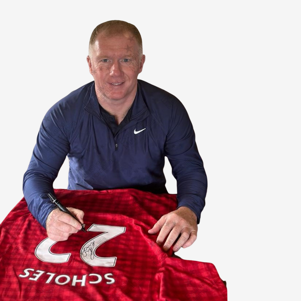 Celebrate the career of a true Manchester United legend with this exclusive, hand-signed 2012-13 home shirt by Paul Scholes. This official shirt features “Scholes 22” name and numbering and is personally signed by Scholes, one of the greatest midfielders in Premier League history. Please note, as these are original shirts, some natural wear and tear may be present.
