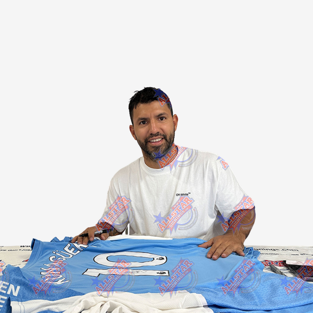 Sergio Agüero signed this shirt in Madrid on January 24, 2023, during a private signing session. Agüero joined Manchester City in 2011 and over ten seasons won five Premier League titles, famously scoring a last-minute winner in his debut season to secure the club’s first league title in 44 years. He also lifted a record six EFL Cups, an FA Cup, and helped City reach their first UEFA Champions League final. Agüero is the fifth all-time Premier League goal scorer and the competition’s highest non-English scorer, with 184 goals.