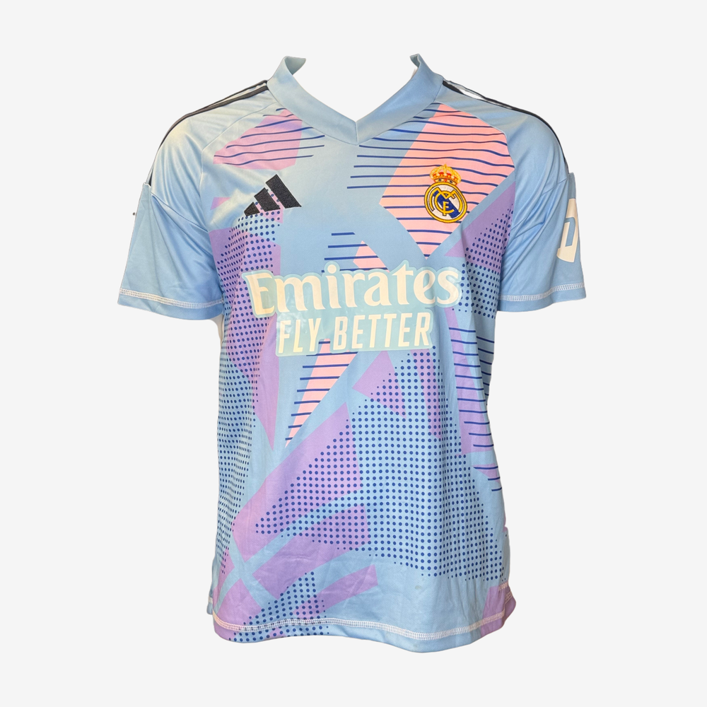 This is the style of goalkeeper shirt worn by Real Madrid during the 2024–25 season. Courtois has been a central figure in Real Madrid’s recent success, known for his commanding presence, reflex saves and decisive performances in the biggest matches, including domestic and European competitions.