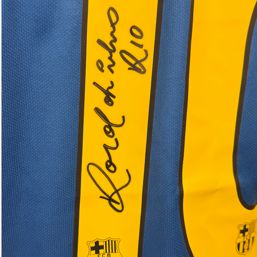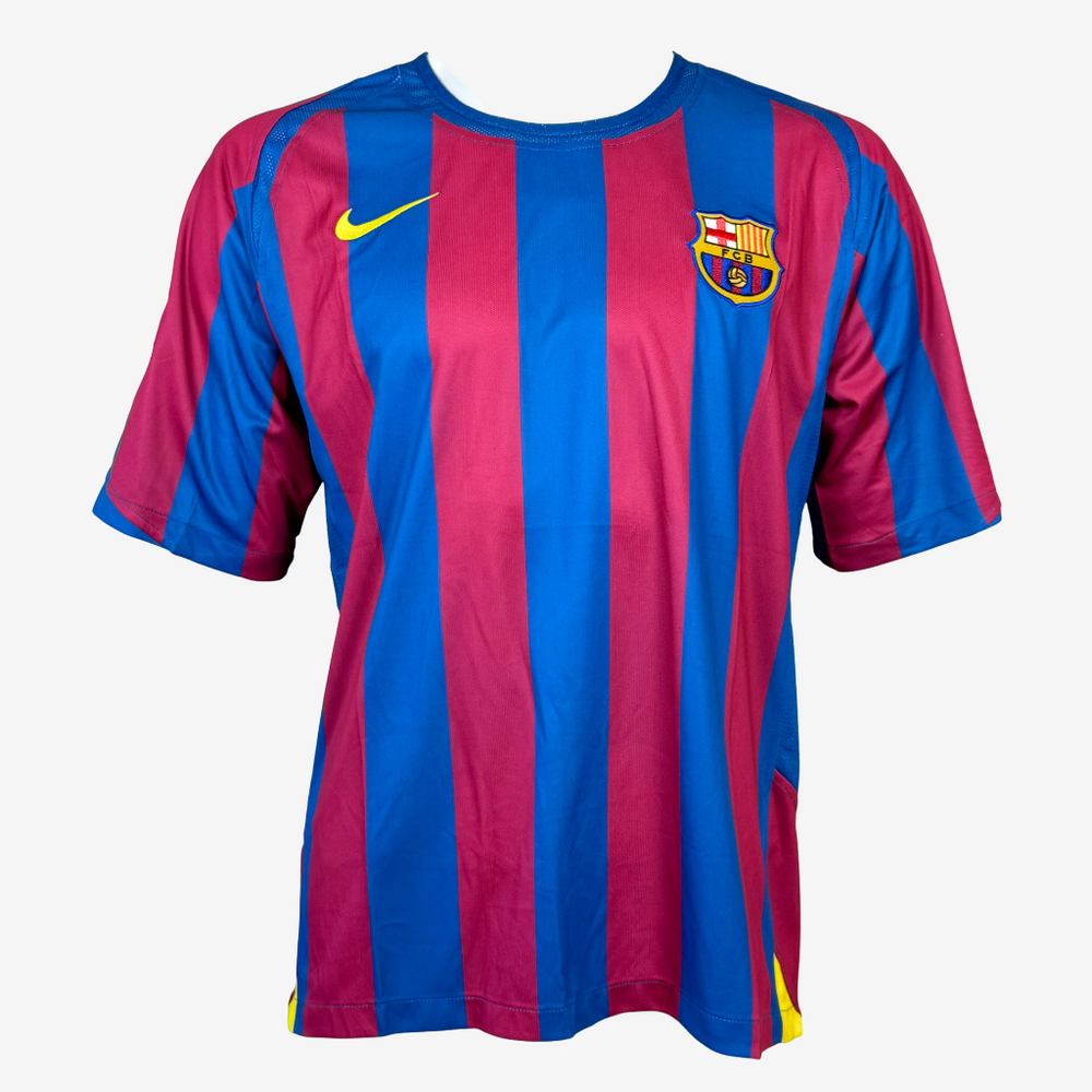 Este é o modelo de camisa usado por Ronaldinho durante a inesquecível temporada 2005-06, com o bordado da final da Liga dos Campeões na manga direita. Naquele ano, Ronaldinho conduziu o FC Barcelona à glória da Liga dos Campeões em Paris, encantando os torcedores com sua criatividade, habilidade e alegria em campo. Suas atuações consolidaram seu legado como um dos jogadores mais queridos da história do clube.